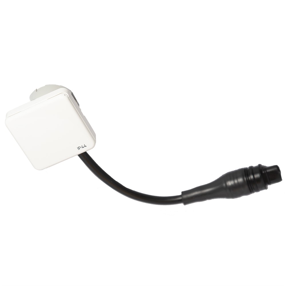 Utanpåliggande Affix-uttag med lock och exklusiv vit ram. IP44-klassad.