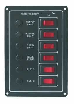 Automatsäkringspanel med 6 st belysta brytare. Tillverkad i svarteloxerad aluminium. Levereras med etikettkarta.Spänning: 12 VVattenklassning: IP65Säkringar: 2 x 5A, 2 x 10A, 2 x 15A