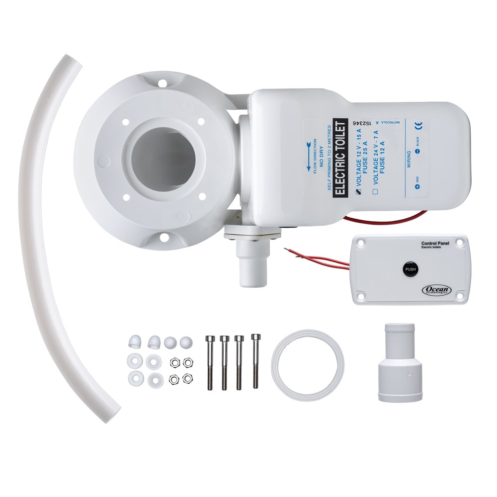För konvertering av manuell toalett till toalett med elektrisk spolning och tömning. Inbyggd avfallskvarn.
