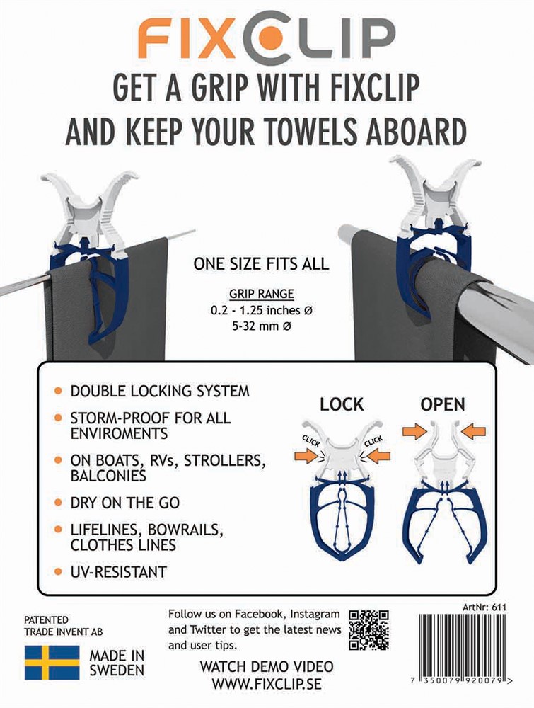 FixClip håller ett stadigt grepp om handdukar, kläder, presenningar etc, även i kraftiga vindar. Det flexibla greppomfånget på 5-32 mm möjliggör en bred användning.
