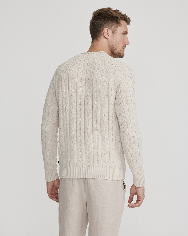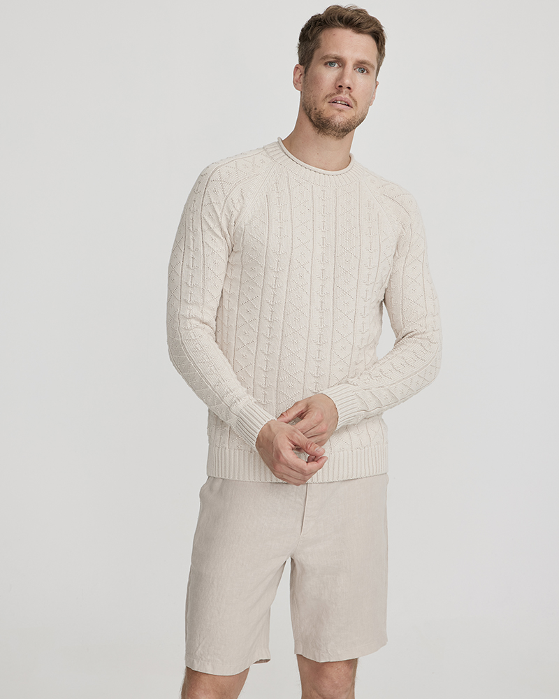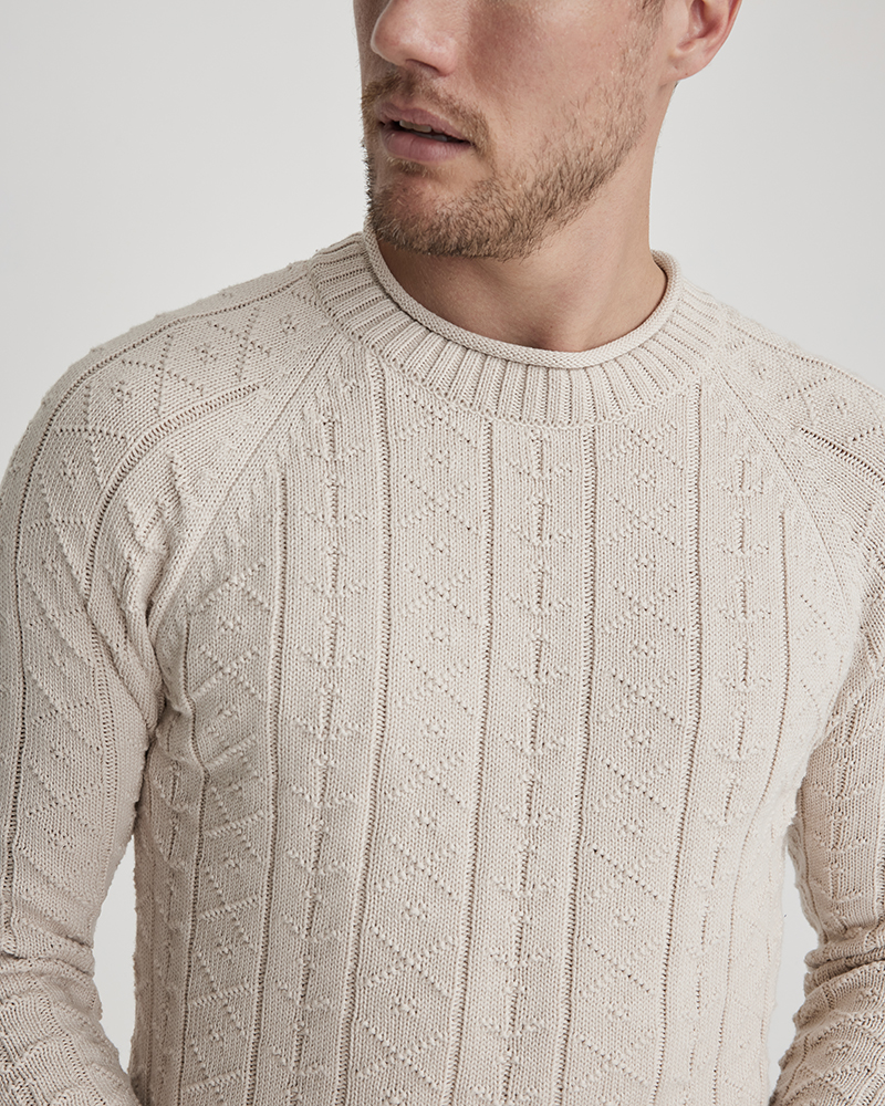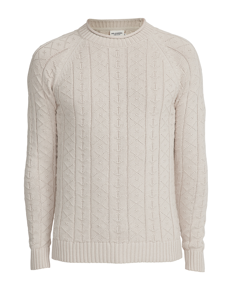 Tröja i 100% ekologisk bomull som har ankarmönster i stickningen. Rundhalsen har ribb och rullavslut medans ärm och kropp har vanligt ribbavslut.