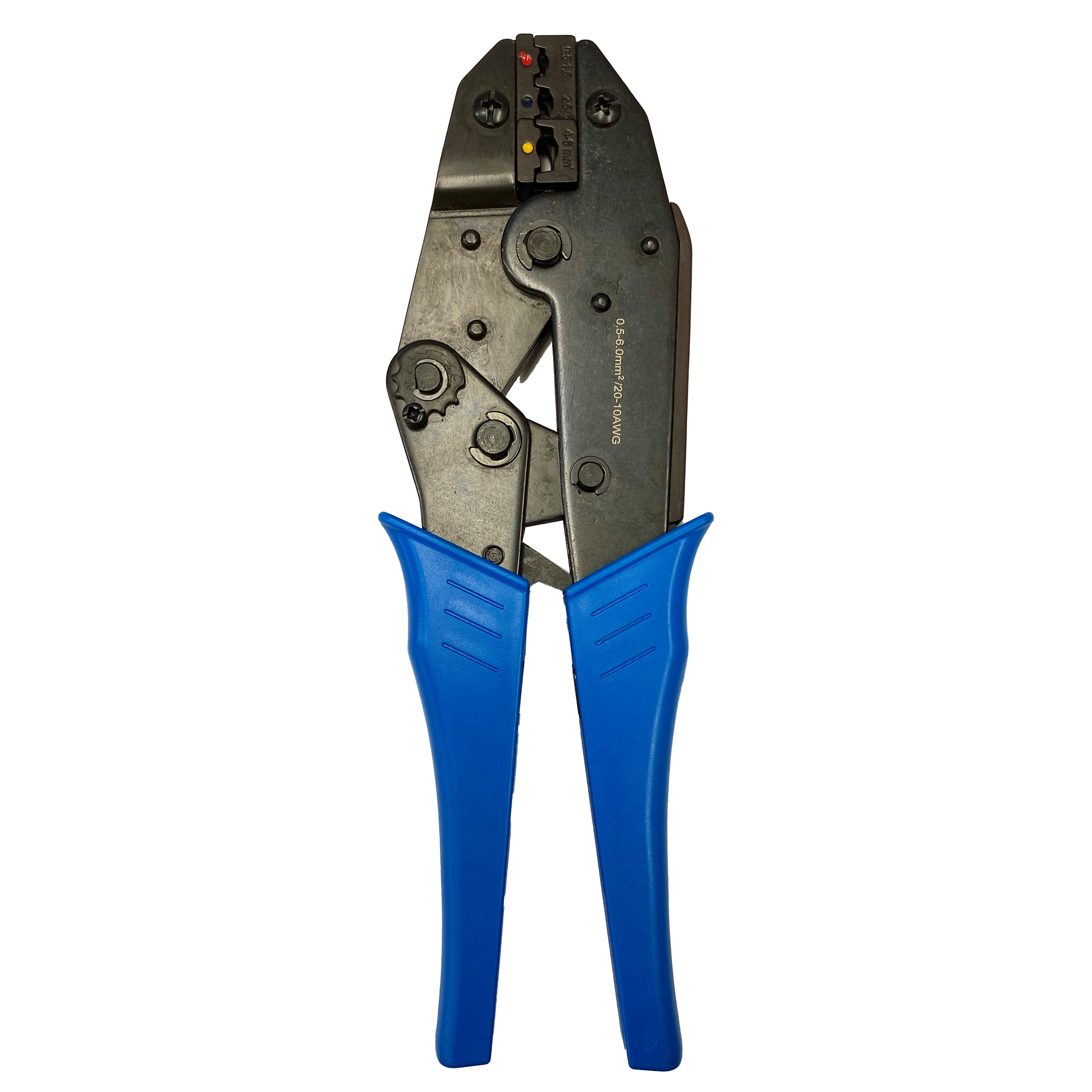 Inbyggd spärr som gör att pressningen fullföljs. Kontaktpressar isolerade kabelskor. Färgmarkerade presskäftar 0.5-1mm² (röd), 1.5-2.5mm² (blå) samt 4-6mm² (gul).