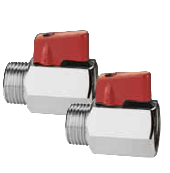 Liten kulventil med invändig/utvändig gänga. Tillverkad i kromad mässing (CW614N), handtag i nylon.