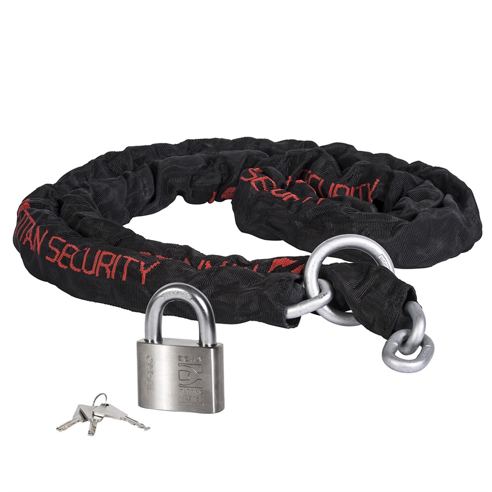 Låspaket bestående av 2,5 m kätting med löpring, skyddshölje och hänglås (BEMA RF 360). Godkänt och certifierat. Dacrombehandlad för utmärkt antikorrosion.