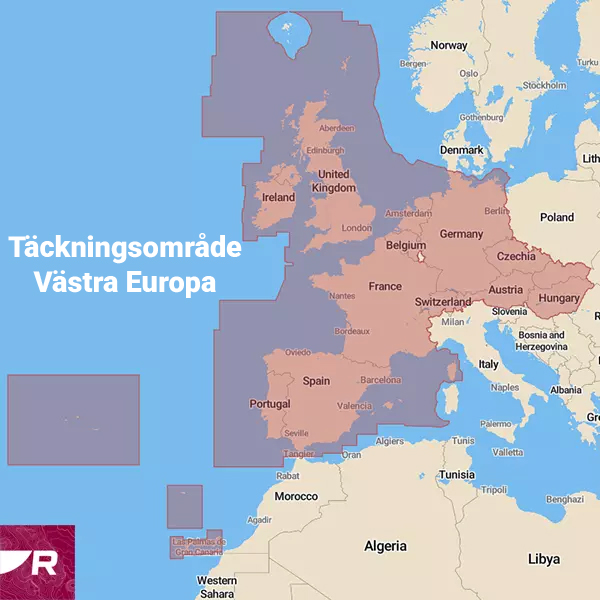 I sjökortets täckningsområde ingår detaljerade sjökort över västra Europa.