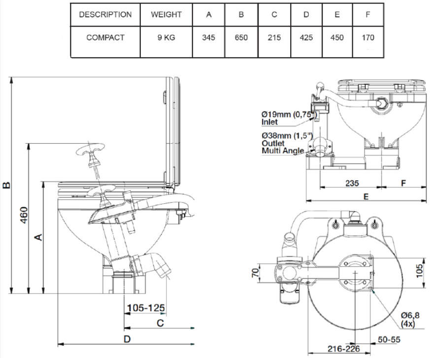Manuell toalett med sits och lock av plast. Hålbilden är anpassad för att enkelt ersätta Jabsco, RM, eller andra modeller. Kan monteras såväl ovanför som under vattenlinjen. Möjlighet att montera pumpen på både sidor om skålen. Pumpen är självsugande.Ø inlopp: 19 mm (3/4’’)Ø utlopp: 38 mm (1 1/4’’)