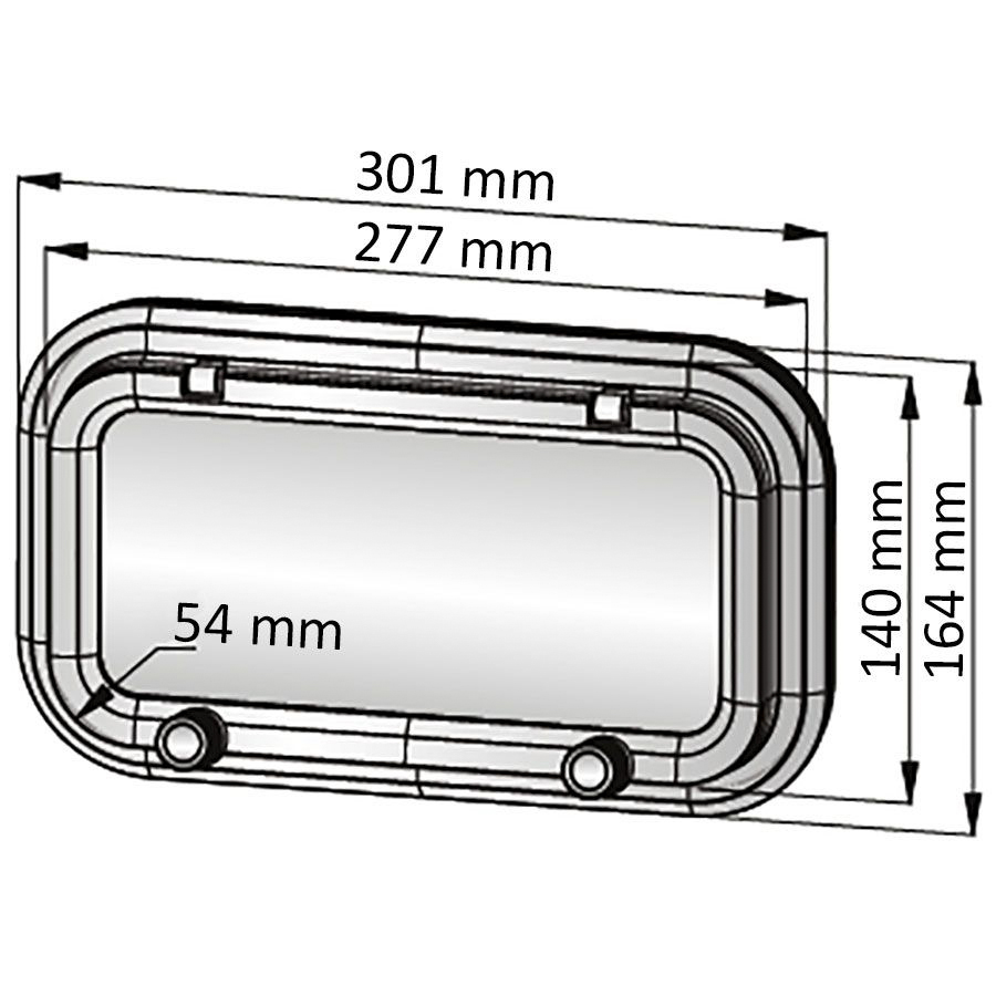 Öppningsbar portlight med rökfärgat acrylglas och satinanodiserad aluminiumram. Klämfästet säkerställer att inga fästelement är synliga varken från insidan eller utsidan. Levereras med innerram och myggnät.