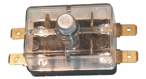 Svart säkringsdosa med plats för 2 st porslinsäkringar som ingår.Genomskinlig skyddskåpa.Anslutningen sker med flatstift