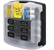 Säkringshållare för marint bruk. Glöm gamla porslinssäkringar och använd de moderna Autofuse flatstiftssäkringarna som sitter i nästan alla bilar. Tillverkad i slagtålig Lexan och har ett skyddslock. Plats finns för reservsäkringar.Central matning för upp till 100 A på plussidan och en minusskena, så att man kan ansluta både plus och minus.Skruvanslutning för ringkabelskor, naturligtvis förtent och rostfritt material.