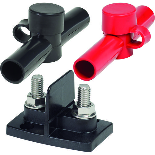 2 st. 10 mm anslutningar. Alla ledande delar i förtennad koppar. Levereras med en svart och en röd isolator.