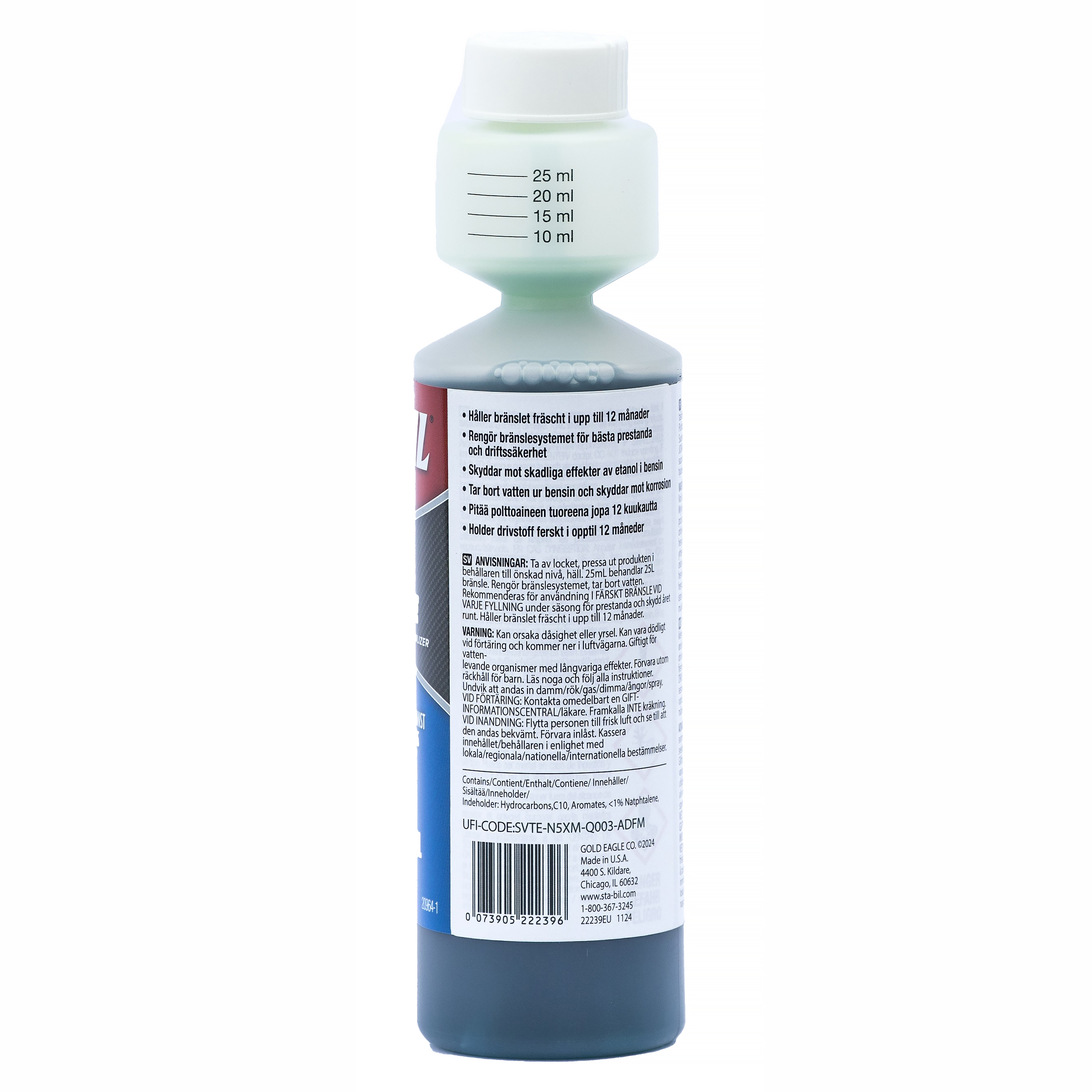 ml (milliliter) 250 Volym (ml) 250 Information 250 ml STA-BIL behandlar 250 liter bensin. EAN-kod: 073905222396 -