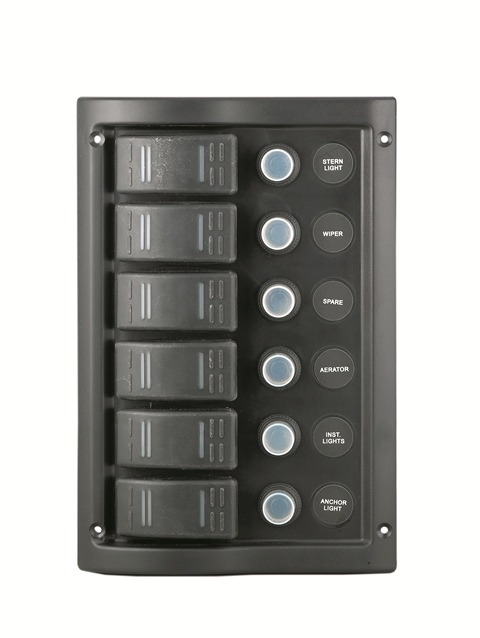 Vattentät strömbrytarpanel tillverkad i UV-stabiliserad plast. Försedd med 6 st LED-belysta strömbrytare. Levereras med etikettkarta.Spänning: 12 VVattenklassning: IP65Säkringar: 1 x 5A, 3 x 10A, 2 x 15AUL-godkända strömbrytare