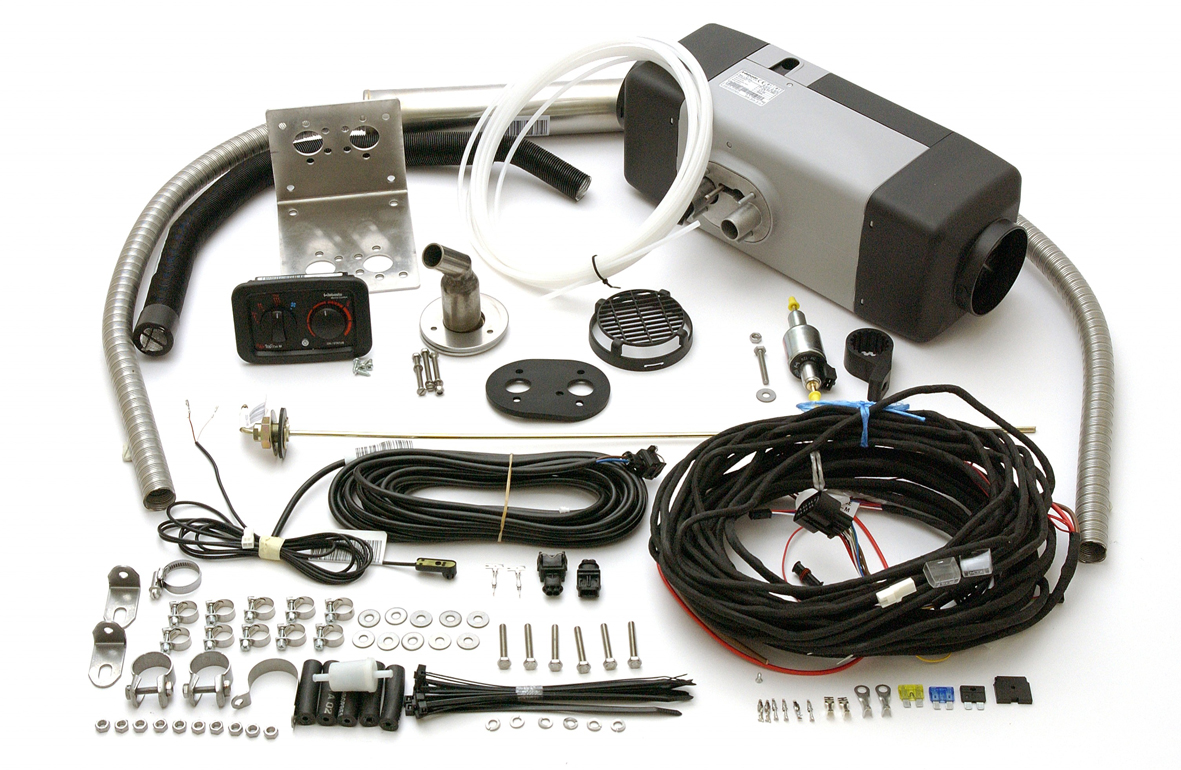 Satsen innehåller:- Själva dieselvärmaren, manöverpanel, kablage, bränsledoserpump och fäste, externtempsensor, värmarfäste L-formad, avgasljuddämpare, bordsgenomföring för avgaser, förbränningsluftslang, mm- Man kan använda såväl ø 80mm som ø 90mm luftslang till huvudkanalenSpecifikationer
